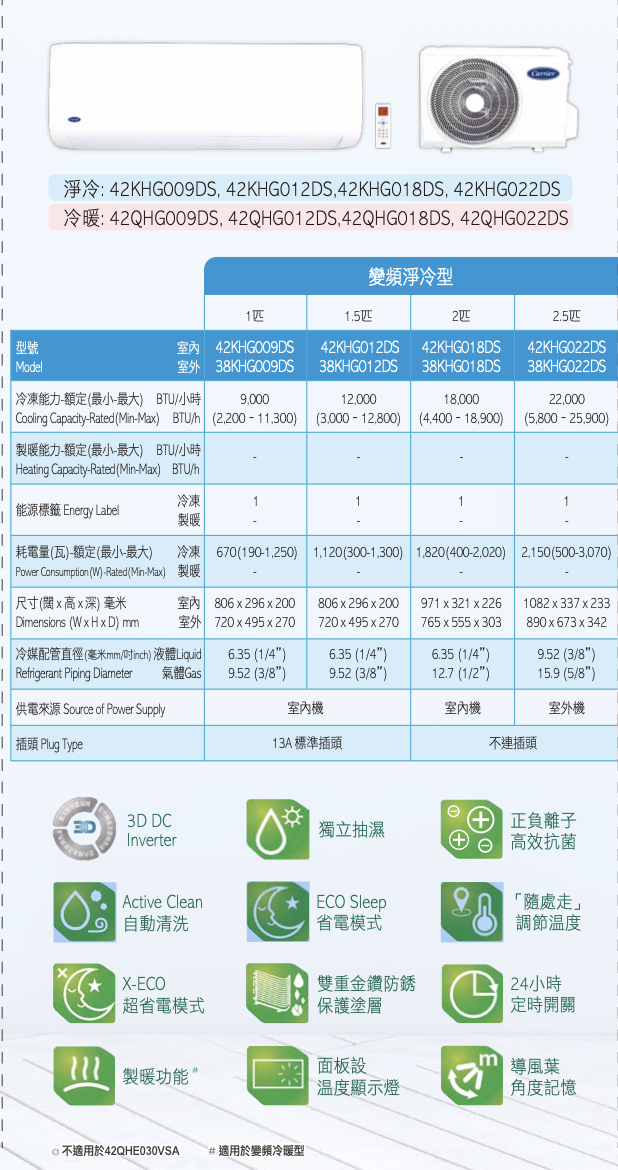 ·比傳統分體機慳電26%: 開利全直流變頻技術3D DC Inverter,保持恒定溫度外,更大大節省電源 (以開利一匹掛牆式分體機42KCEN09E及一匹變頻式分體機42KHG009DS比較)