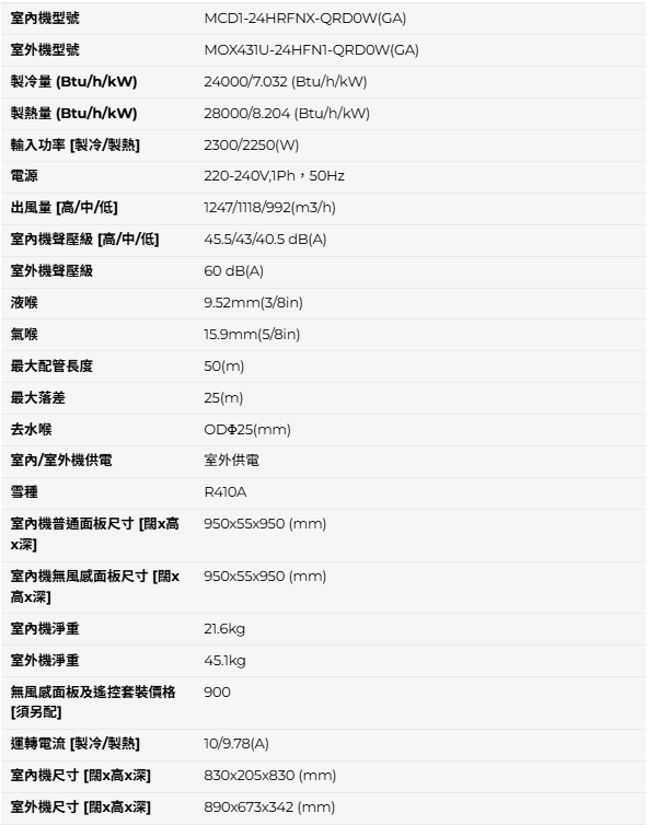 Midea 美的 MCD1-24HRFNX-QRD0W 3.0匹 變頻冷暖 藏天花卡式分體冷氣機