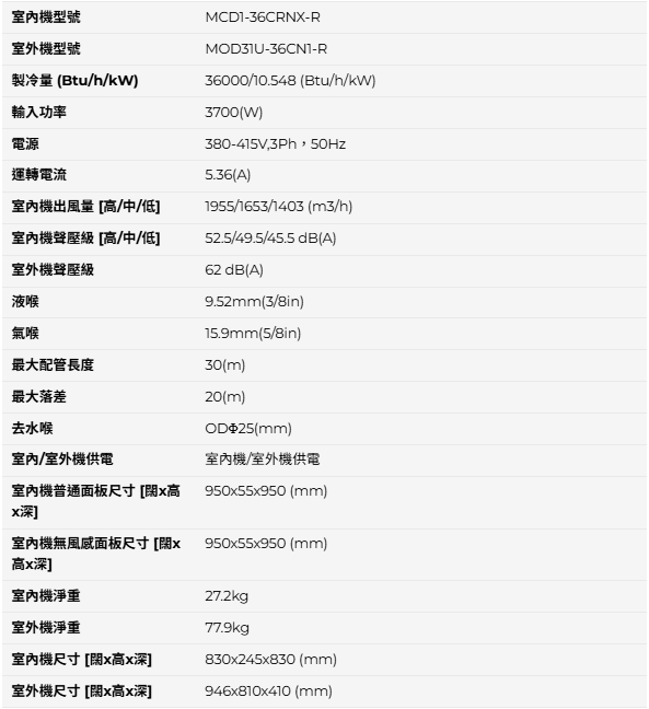 Midea 美的 MCD1-36HRFN8-QRD0W 4.0匹 變頻冷暖 藏天花卡式分體冷氣機
