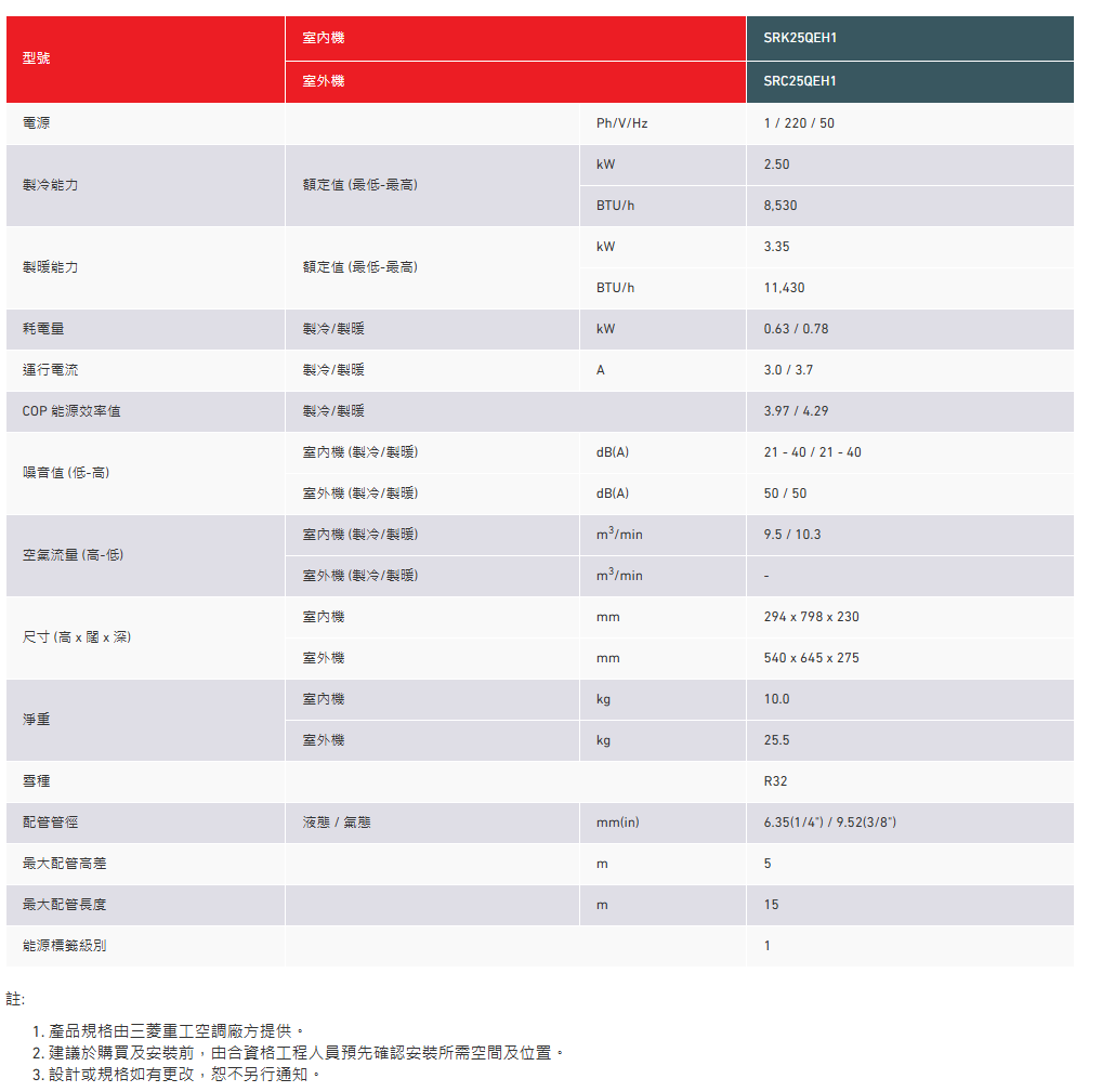 Mitsubishi Heavy 三菱重工 SRK25QEH1 1.0匹 變頻冷暖 掛牆式分體冷氣機