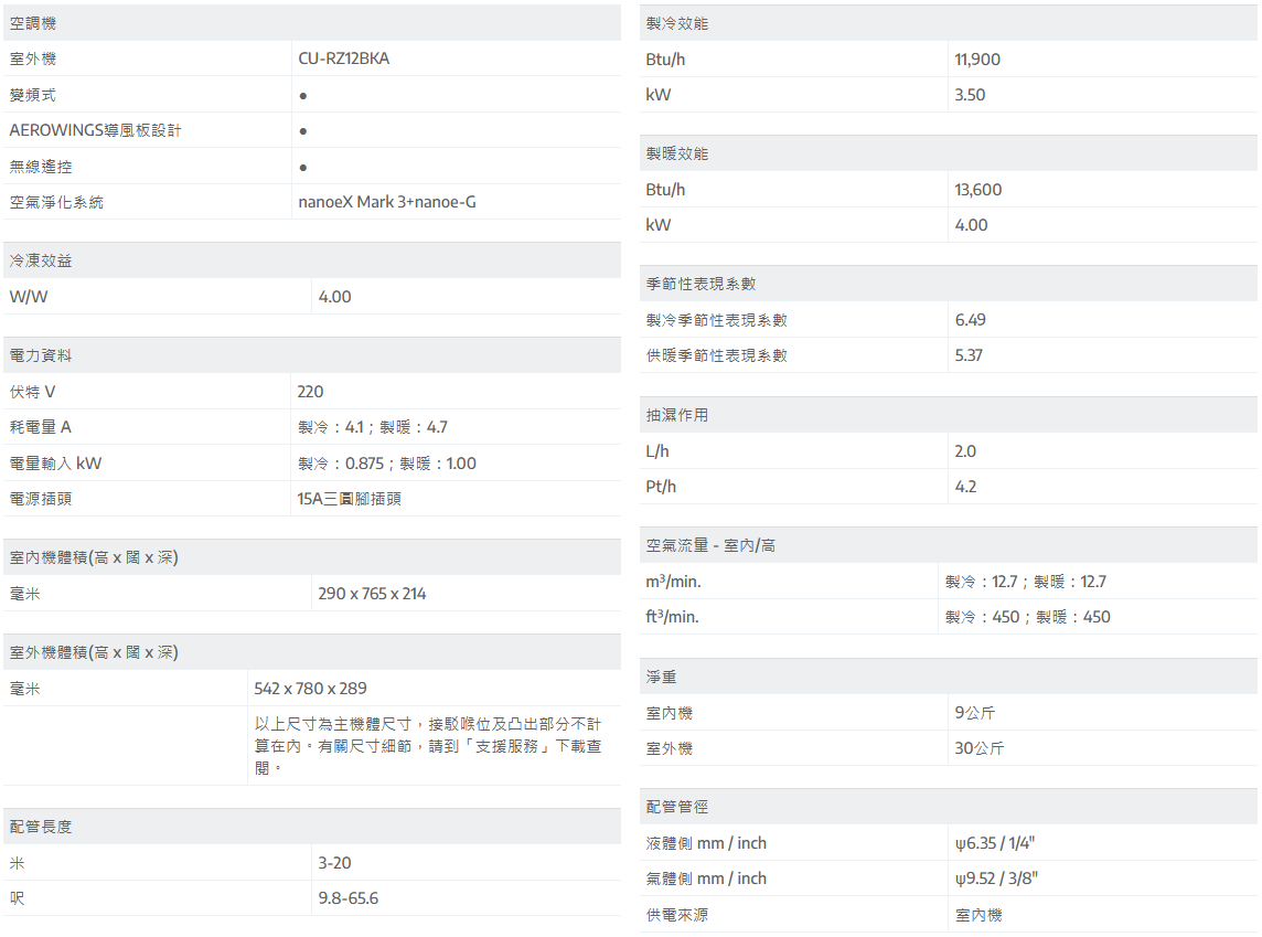 Panasonic 樂聲 CS-RZ12BKA 1.5匹 Wi-Fi 智能 變頻冷暖 掛牆式分體冷氣機