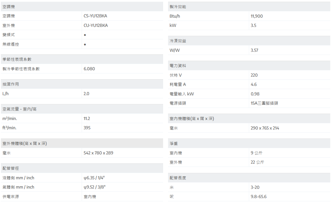Panasonic 樂聲 CS-YU12BKA 1.5匹 變頻淨冷 掛牆式分體冷氣機