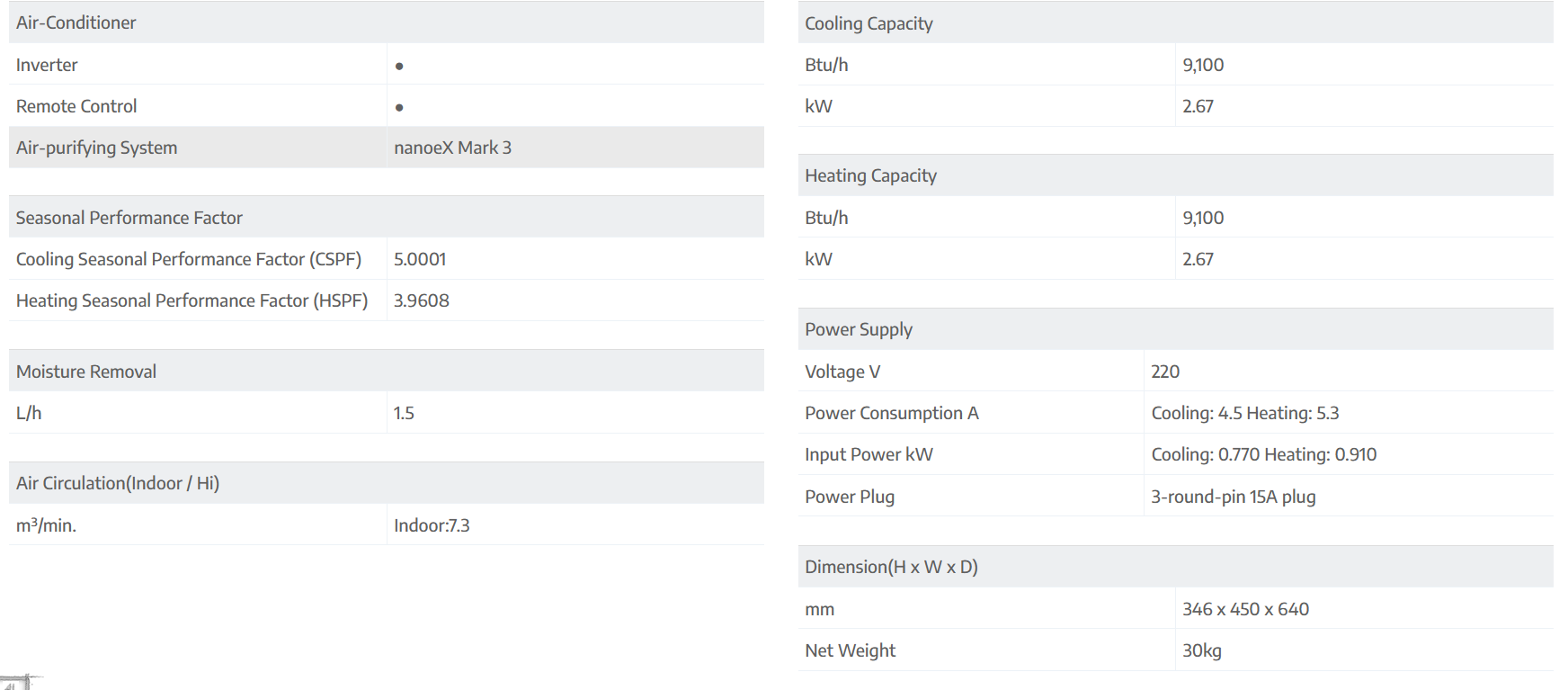 Cooling/Heating Capacity: 9,100 Btu/h