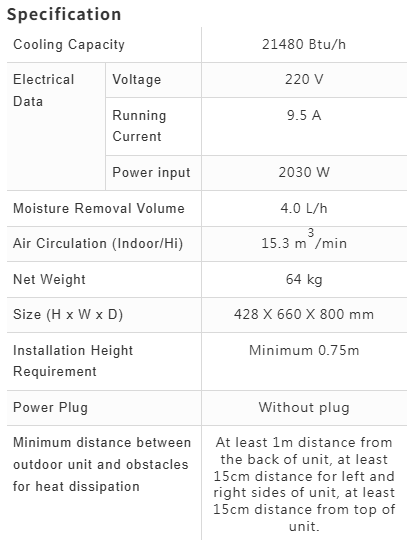 Cooling Capacity: 21,480 BTU/h (2.5HP)